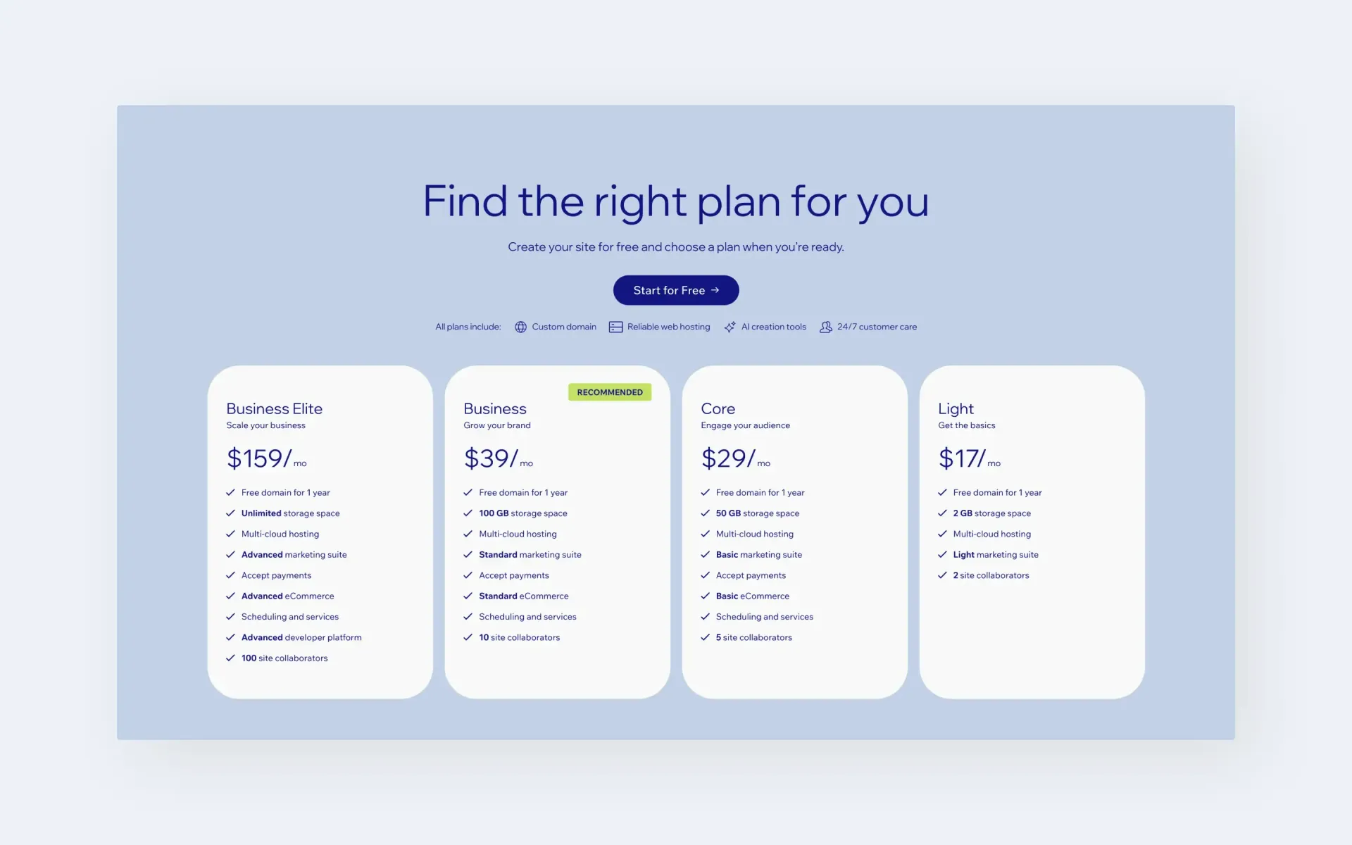 Wix currently offers four pricing options with personal plans ranging from $17 to $159/month, and enterprise plans available with custom pricing. If you're looking for the Wix plan that's the best feature-match to Without Code, look at the Core plan for $29/month. You can see Wix pricing here.