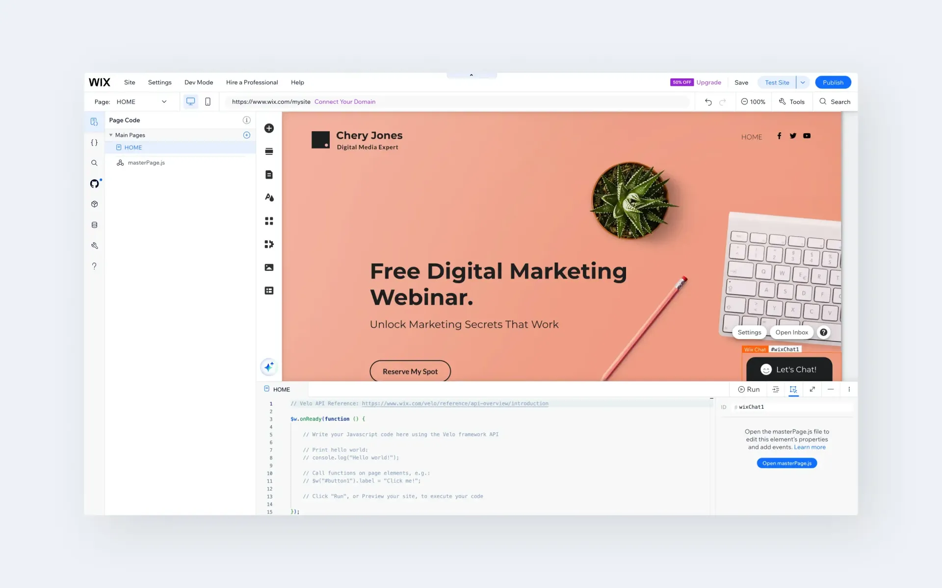 Wix and Without Code have a fair bit in common. Both editors utilize a drag-and-drop editor, allowing users to drop elements to build a page. Both platforms offer the ability to use connected data to generate hundreds of dynamic pages based on a single page layout. And both platforms offer access to site code for those that need it.