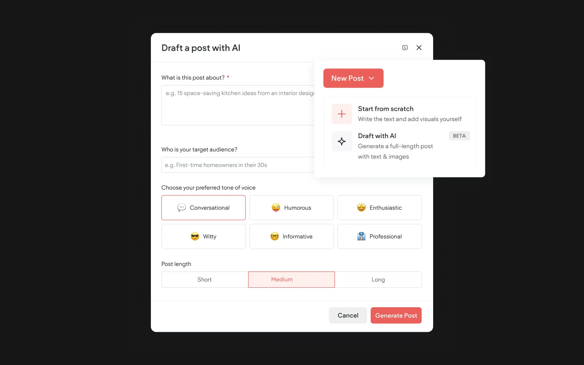 Draft with AI. Fill in the requested details about your business, topic, audience, and tone, then generate the post and make any edits you want before publishing.