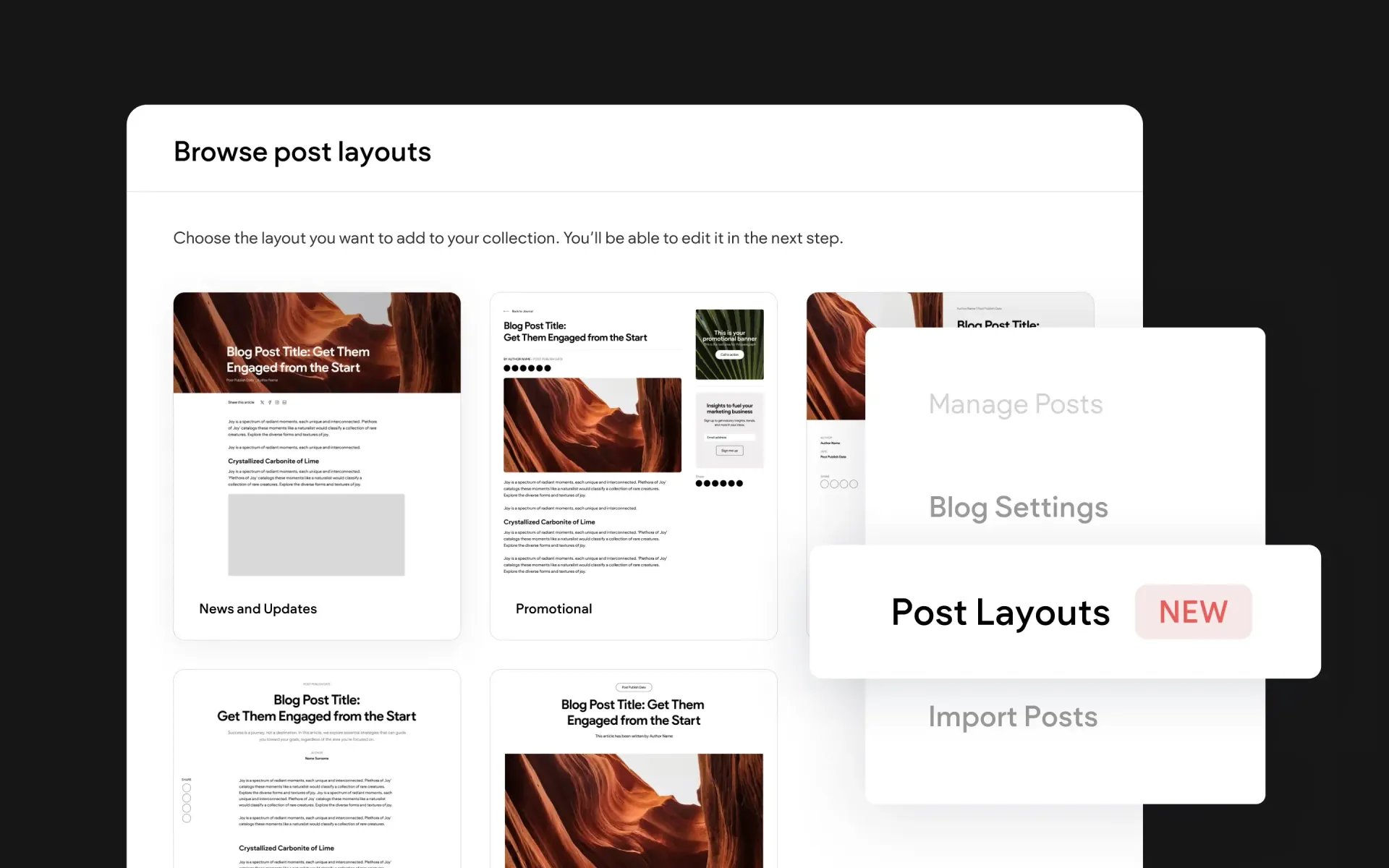 Open your blog layout settings to create additional post layouts. When editing a post, choose the layout you want to apply from the