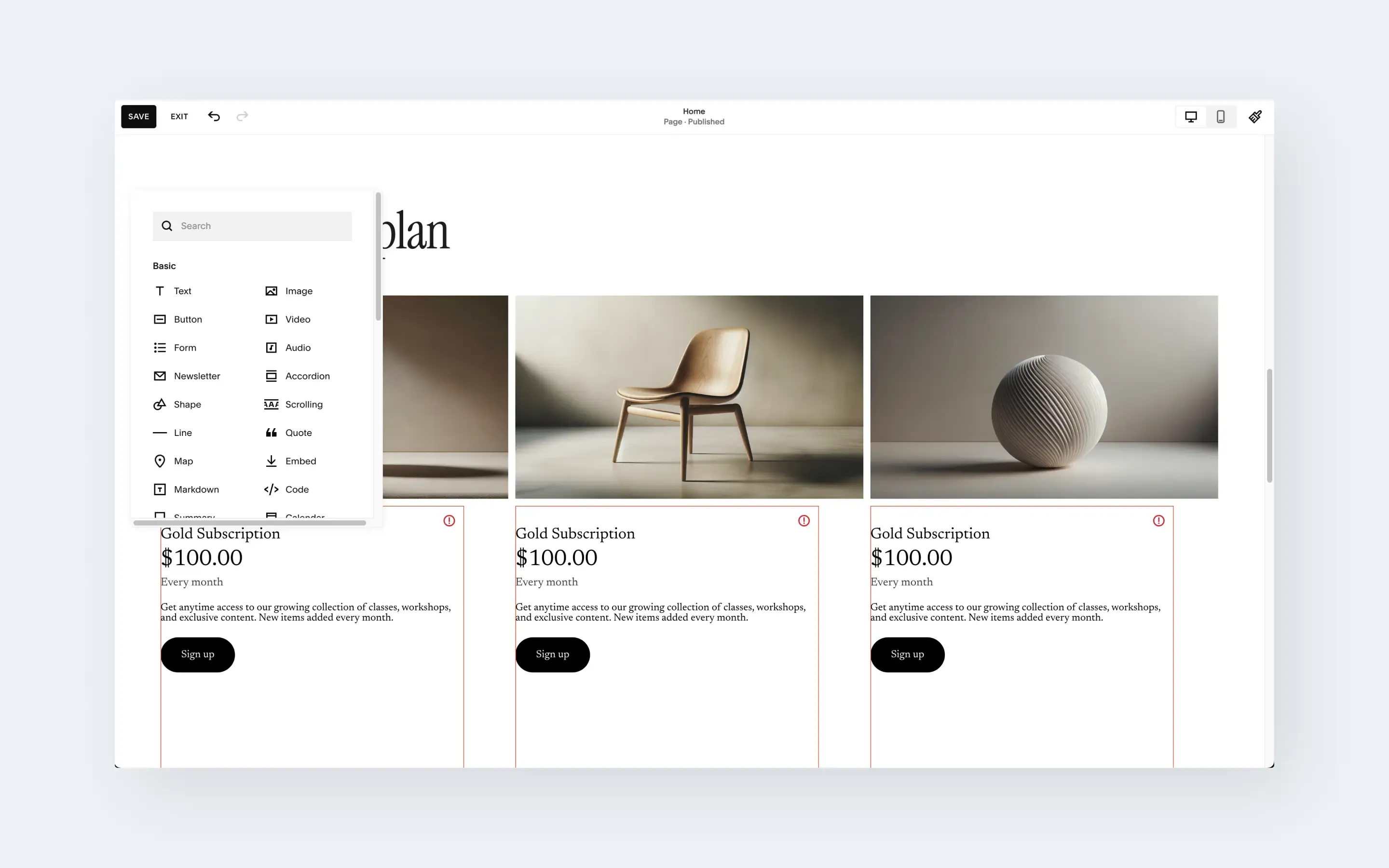 Squarespace refers to all of the elements you add to your site as "content blocks". Content blocks range from basic fundamentals such as text blocks and spacers, to integrations like OpenTable and Amazon.