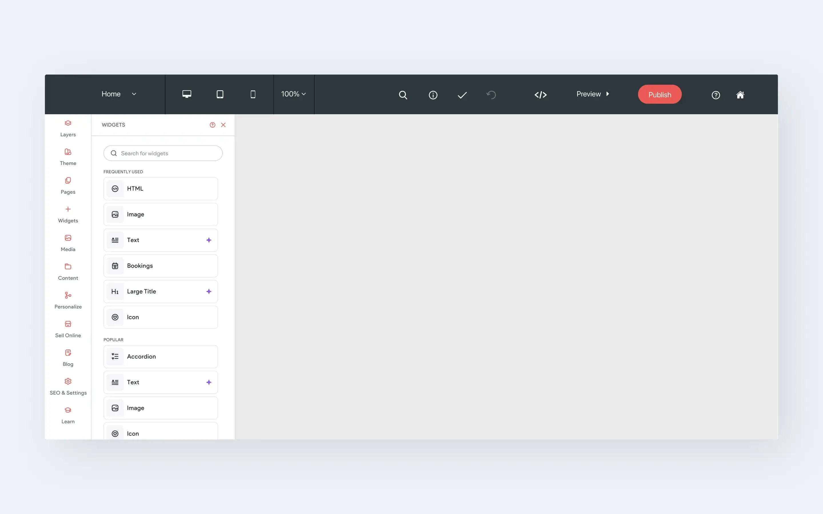 Without Code uses "widgets" as the building block of a site. Widgets are essential to a site's construction, and therefore has a large library of more than 100 widgets. While widgets make up the basics such as buttons and images, they also include many integrations like Calendly and Google Calendar.