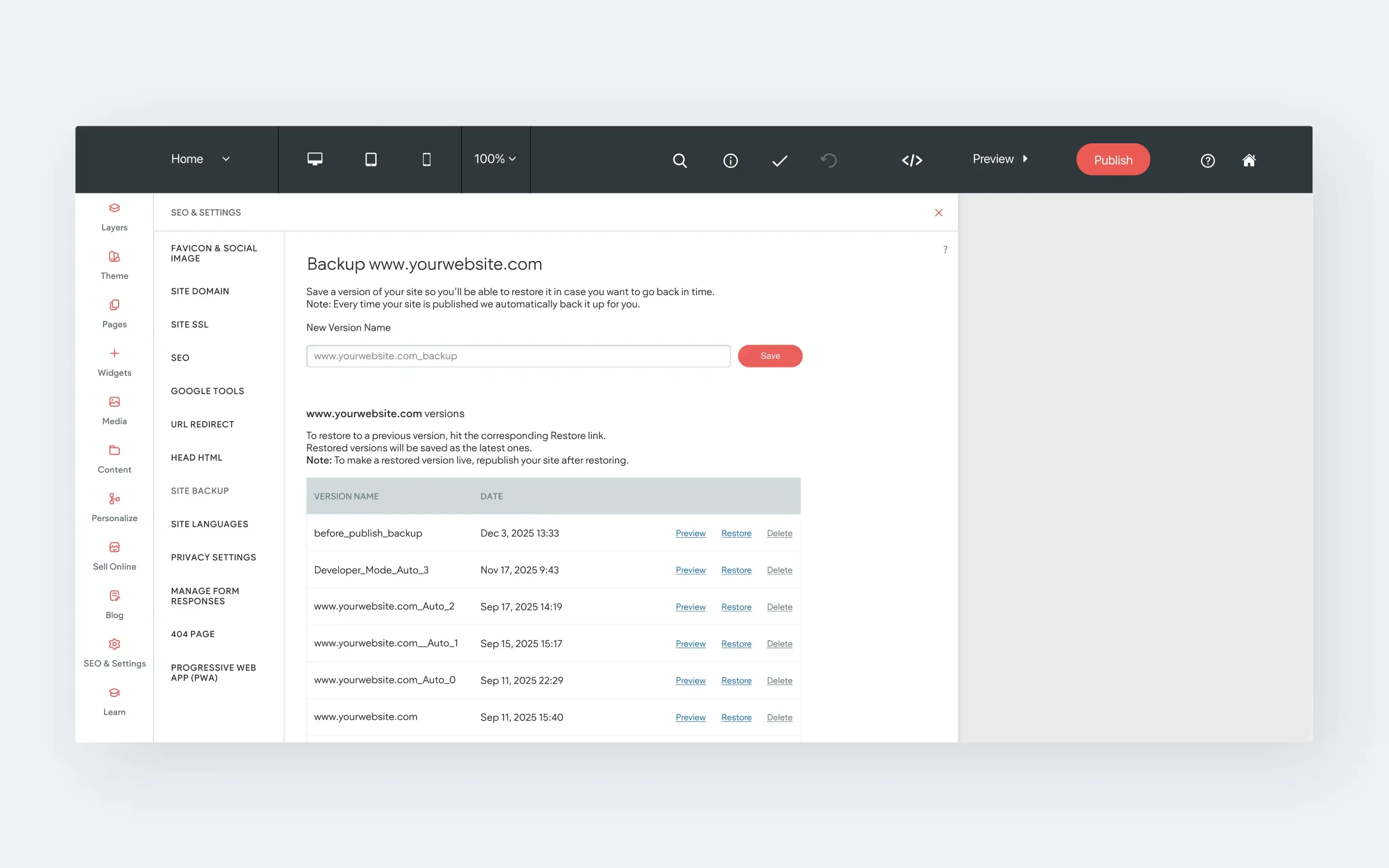 Site backups occur automatically at a set interval. Site backups can also be done manually at any time, within the site editor.