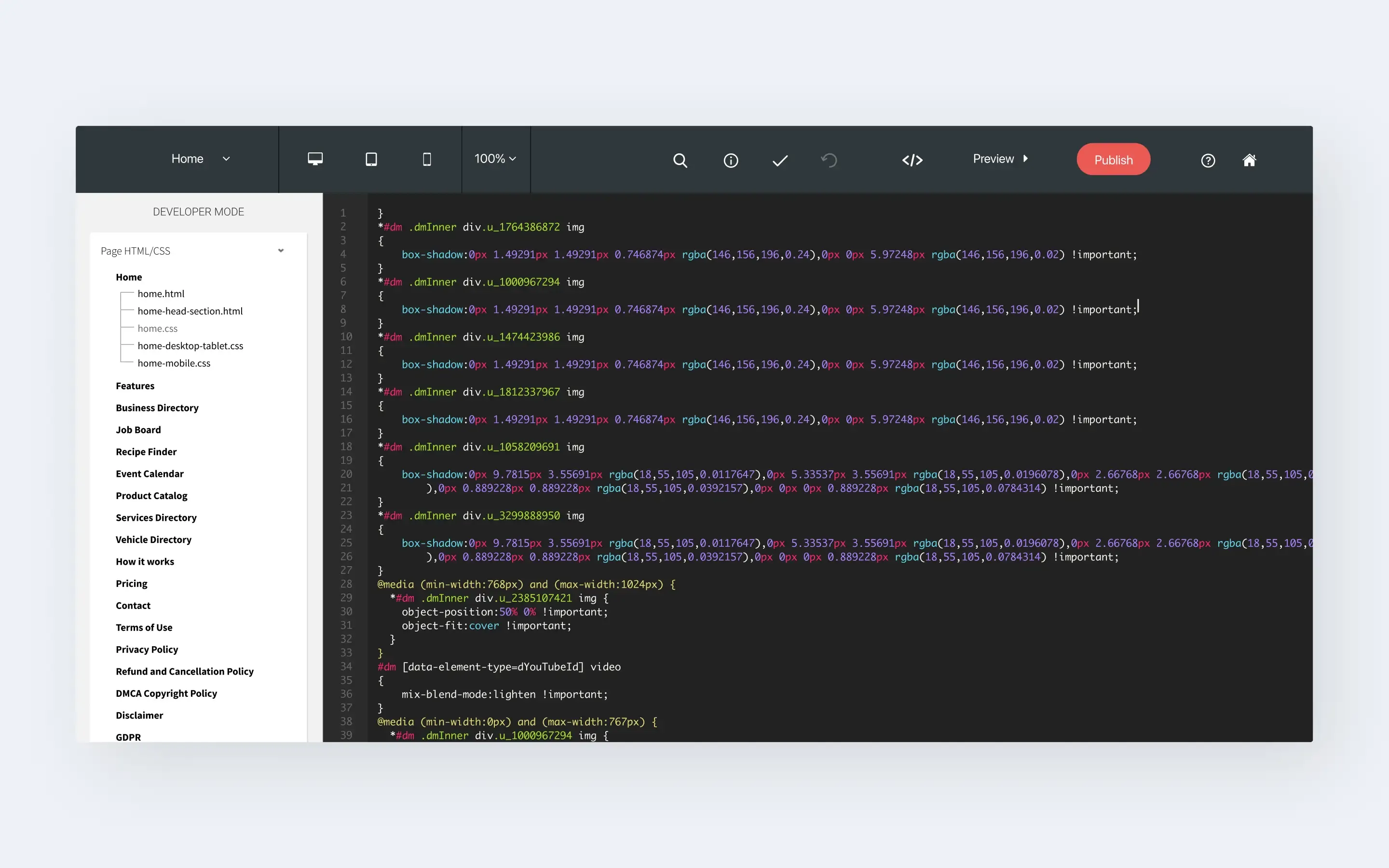 The ability to modify Without Code templates is extensive, and remains the same from template to template. Without Code users will find that the editor allows massive template customization when needed. Site functionalities are tied to the builder, rather than individual templates. This means that any template can theoretically be deconstructed and reconstructed into any other template because the editor allows for a much higher level of modification.