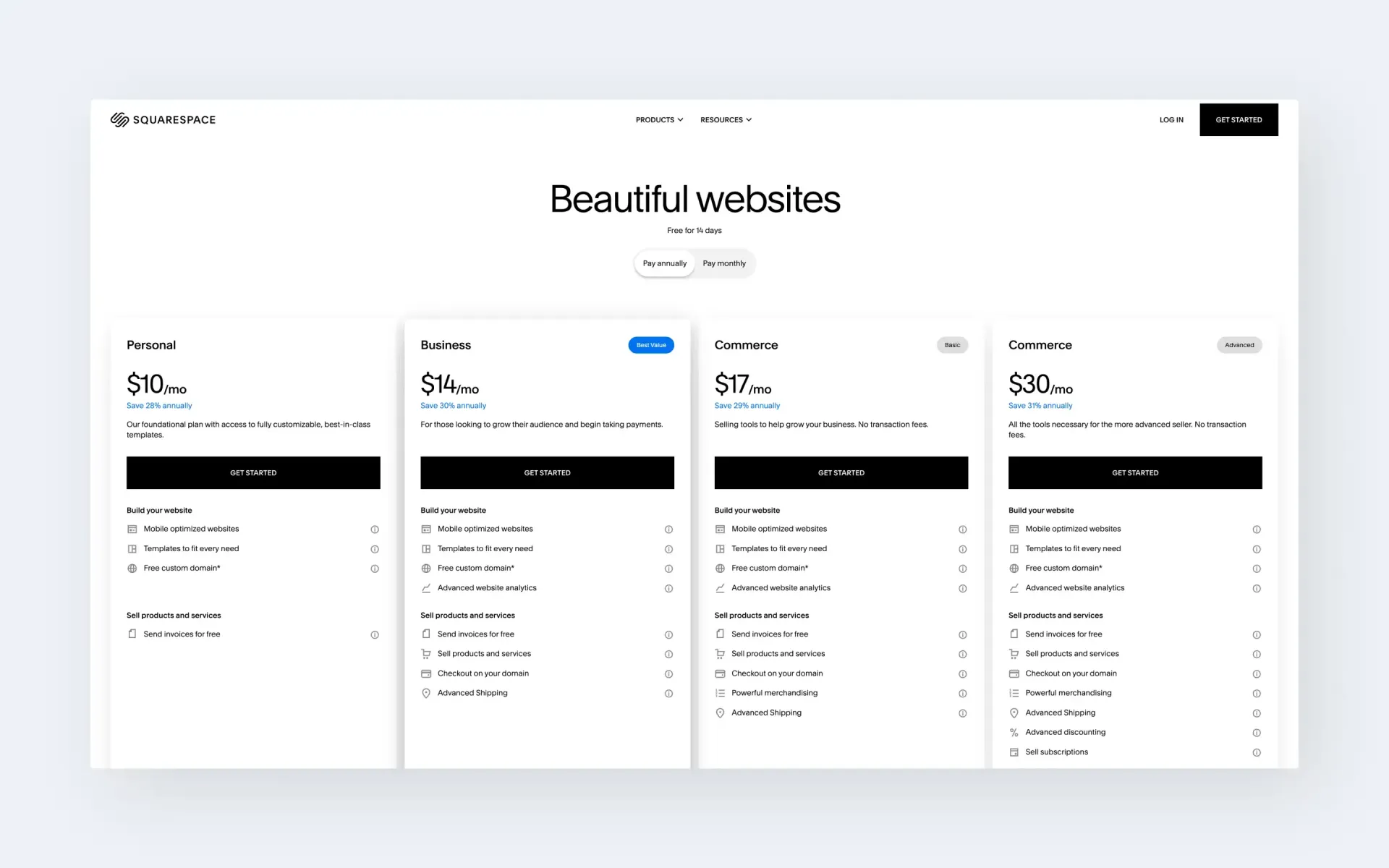 Squarespace plans begin at $16/month for the Basic plan and range up to $99/month for an ecommerce-focused Business plan. These prices represent the cost when paid annually. Monthly prices are 28-36% higher.