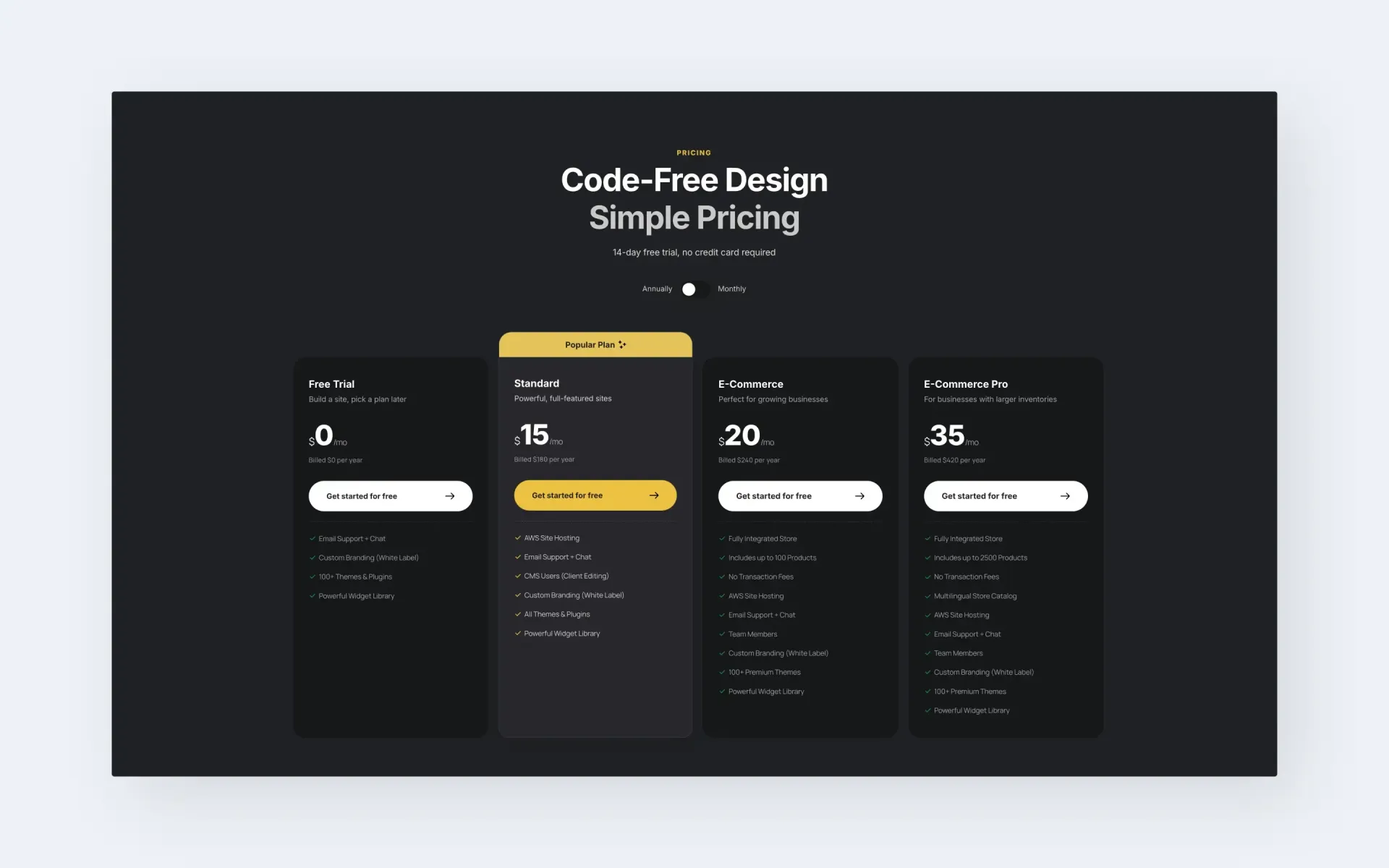 Without Code offers very simple pricing, with a single Standard plan that includes all available features for $15/month. This all-inclusive approach means there are no tiers to sort through unless you need a store with a larger product catalog. Users with bigger stores can choose from ecommerce-focused plans at $20 or $35/month, which support product catalogs beyond the 10-product store included in the Standard plan.